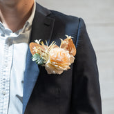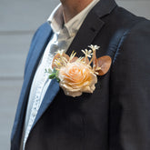 Add a little sunset magic to your look with this warm-toned boutonniere, featuring soft pinks, creamy neutrals, and hints of greenery. Whether it’s for the groom, groomsmen, or a stylish guest, this piece brings a relaxed yet refined vibe.